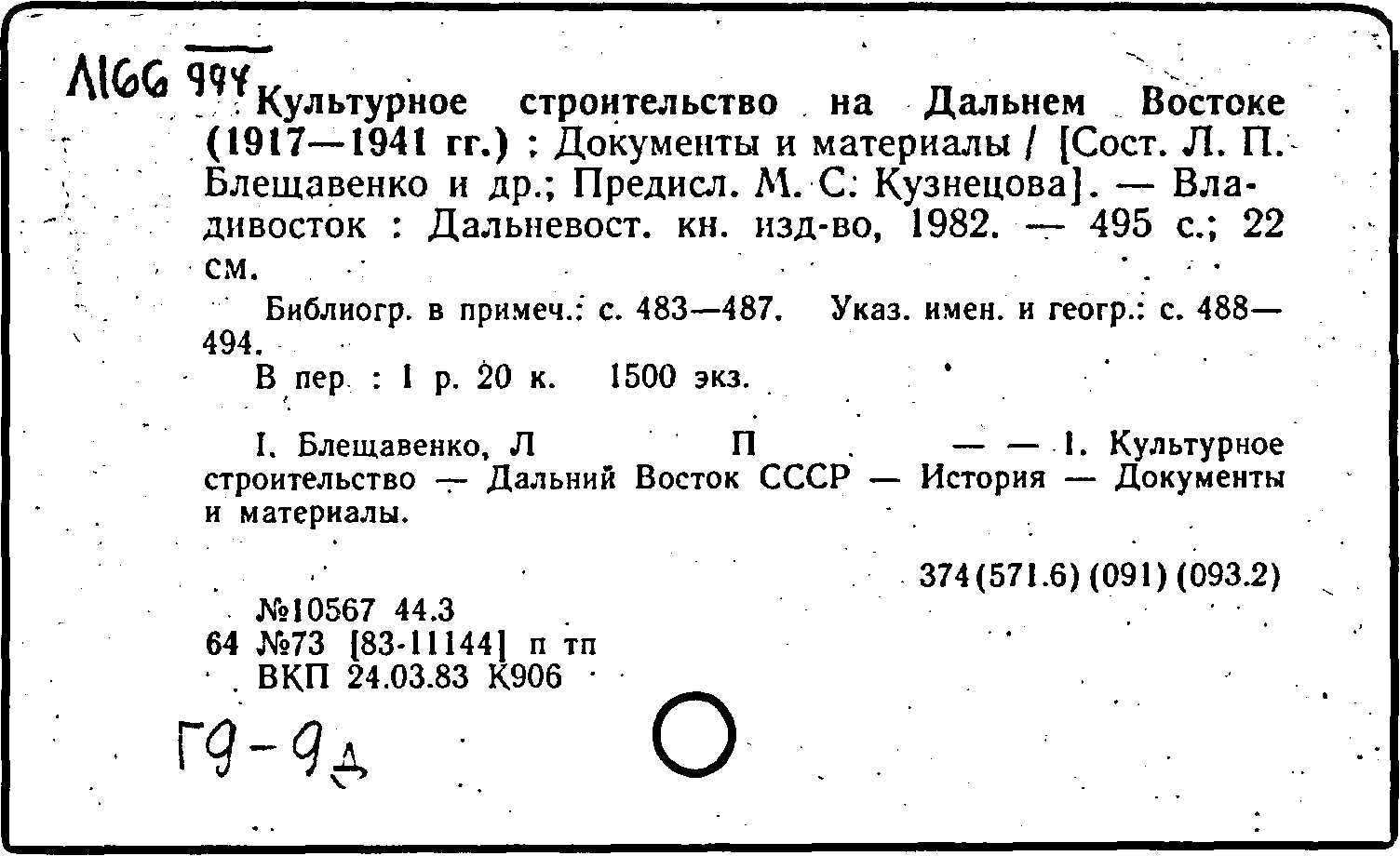 Культурное строительство на Дальнем Востоке (1917-1972 гг.): документы и материалы / [сост. Л.П. Блещавенко и др.; предисл. М.С. Кузнецова]. - Владивосток: Дальневост. кн. изд-во, 1982. - 495 с.