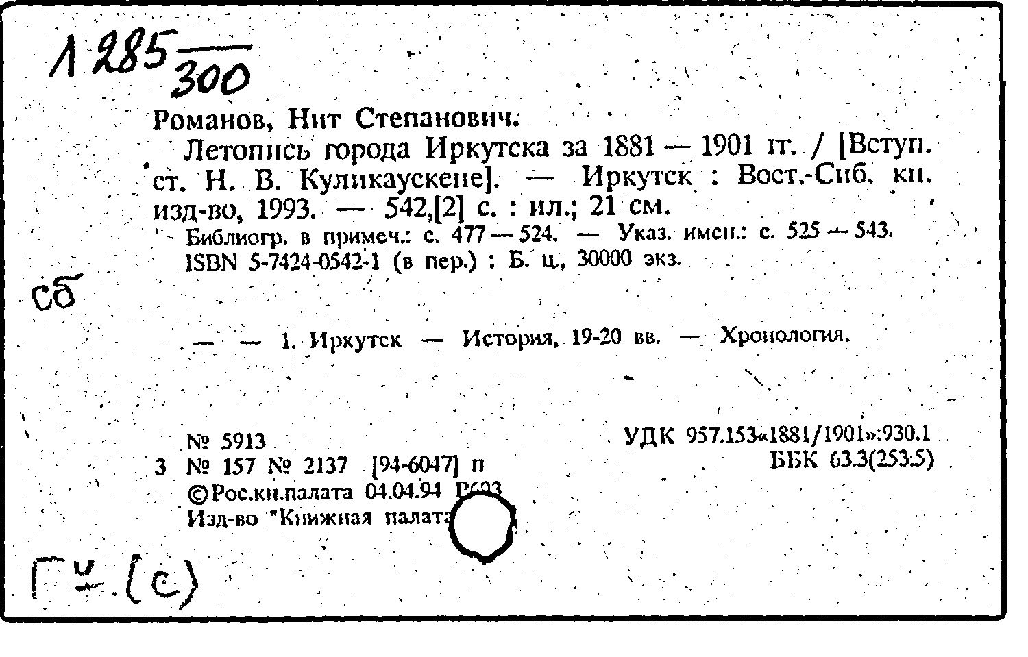 Романов Н.С. Летопись города Иркутска за 1881-1901 гг. / [вступ. ст. Н.В. Куликаускене]. - Иркутск: Вост.-Сиб. кн. изд-во, 1993. - 542, [2] с.: ил.