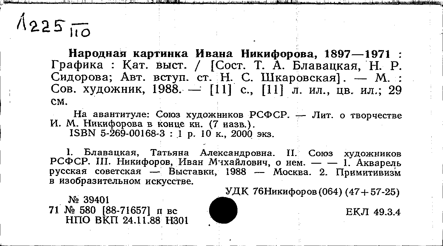 В книжном фонде ГПИБ есть также каталог выставки "Народная картинка Ивана Никифорова, 1897 - 1971", где автором вступительной статьи является Н. С. Шкаровская. Пройдите по ссылке (открыть ссылку), шифр для заказа каталога выставки Л 225/110.
